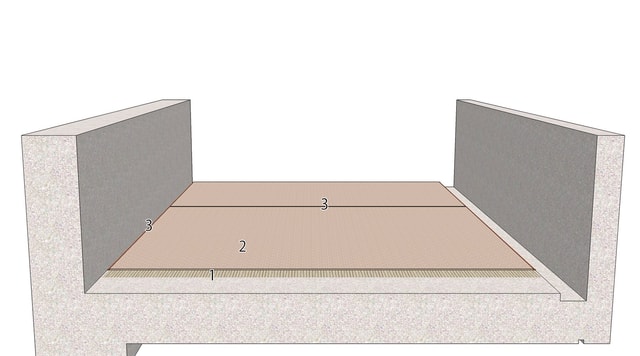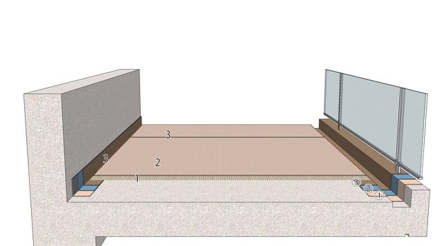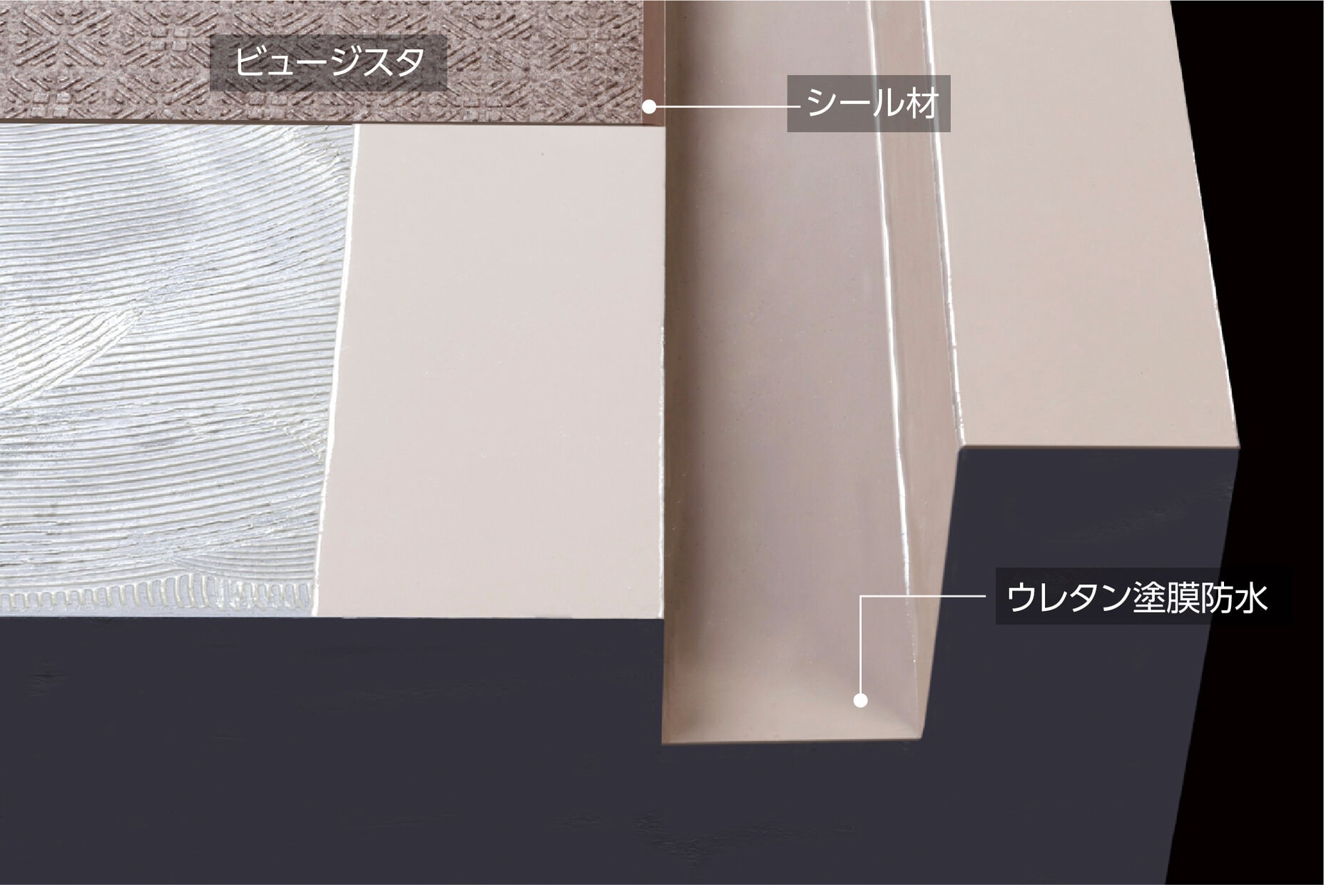 防滑性シートがカバーしていない側溝部や壁際部から雨水が浸入する可能性は高く、この部分もしっかり防水する必要があります。これらには液状のウレタン塗膜防水が最適です。防滑シートと塗膜防水が同一メーカー品なので、防水機能の連続性は確実で安心です。