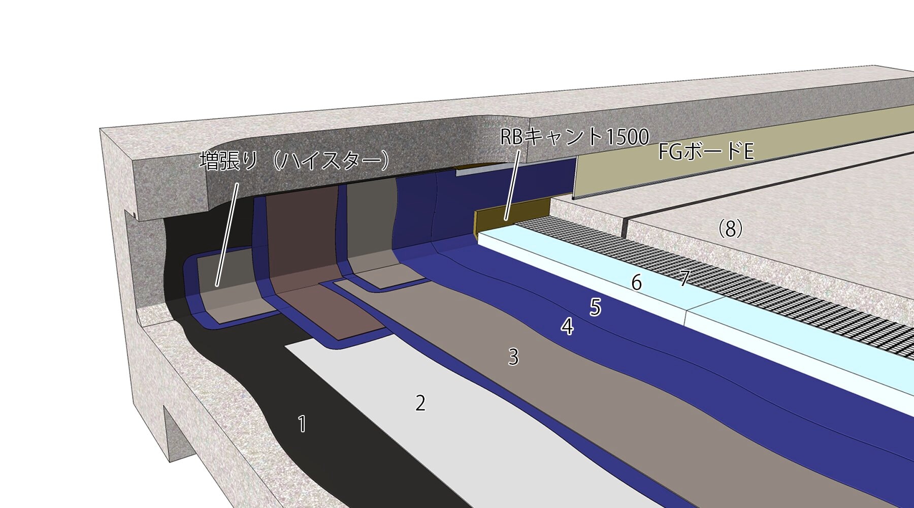 - 部分粘着層付改質アスファルトルーフィングシートを用いる場合の立上り部は、部分粘着層付改質アスファルトルーフィングシート張付けの代わりに、改質アスファルトルーフィングシート(非露出複層防水用R種)1.5mm以上の張付け(使用量1.0kg/㎡)とする。