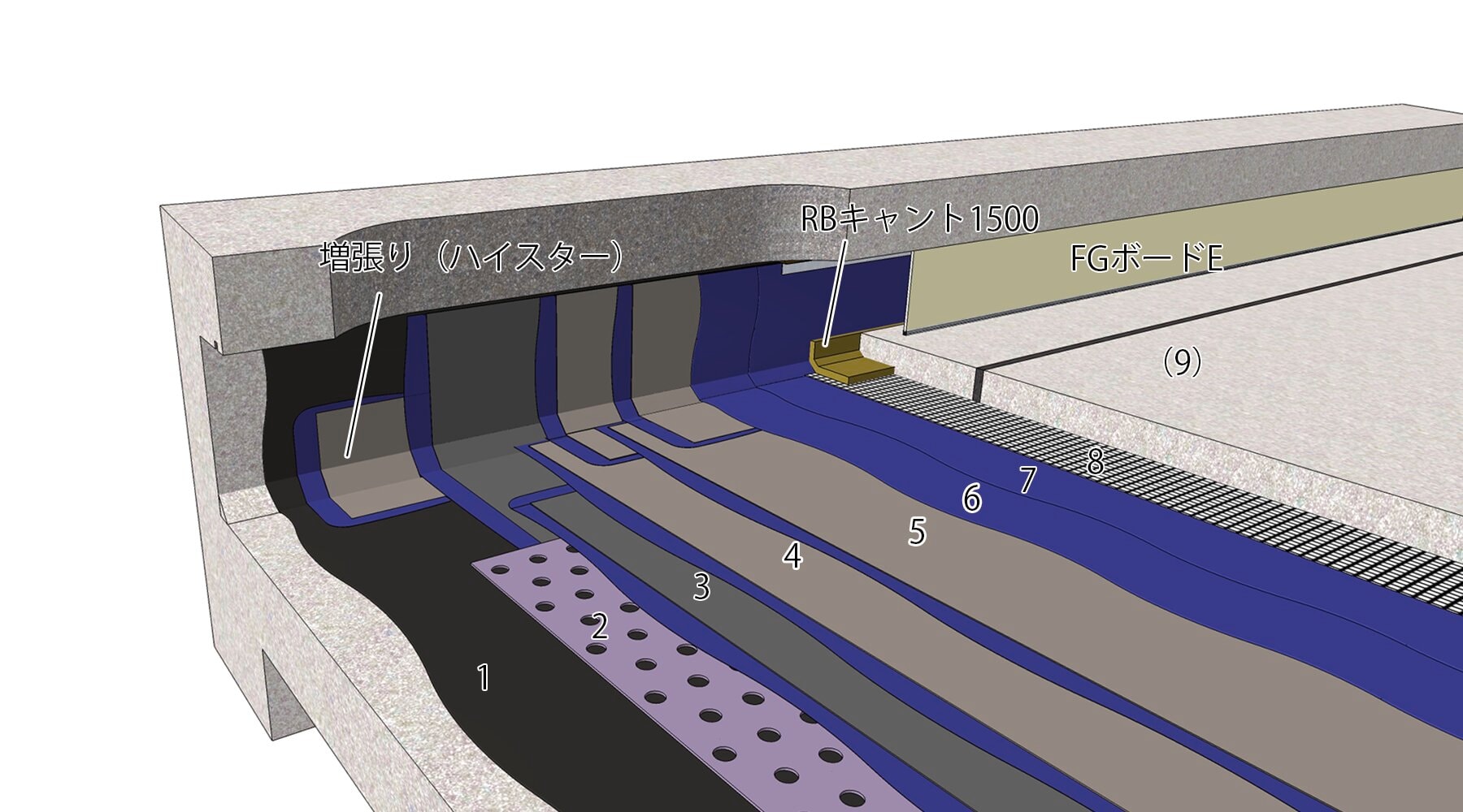 - 部分粘着層付改質アスファルトルーフィングシートを用いる場合の立上り部は、部分粘着層付改質アスファルトルーフィングシート張付けの代わりに、改質アスファルトルーフィングシート(非露出複層防水用R種)1.5mm以上の張付け(使用量1.0kg/㎡)とする。