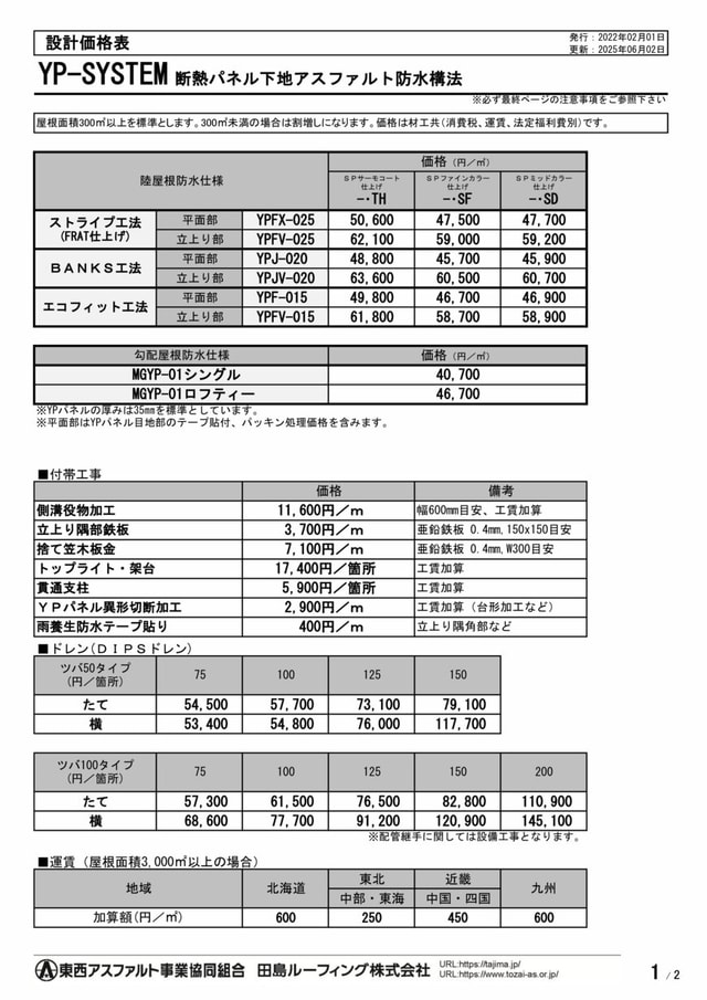 • YPパネルを東西アスファルト事業協同組合組合員が材工で施工する場合を除き、YPパネルの取付けは防水とは別途工事範囲になります。