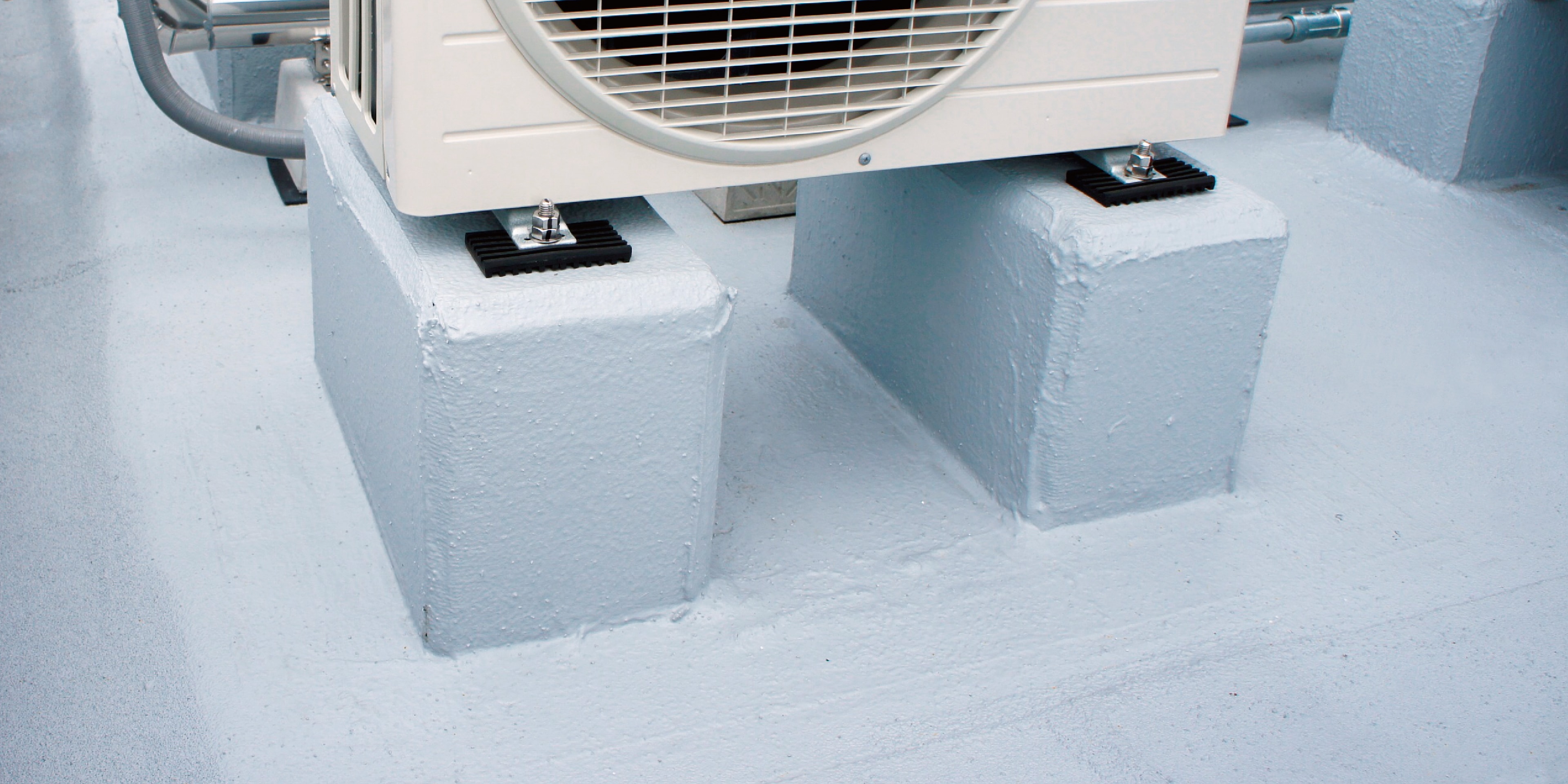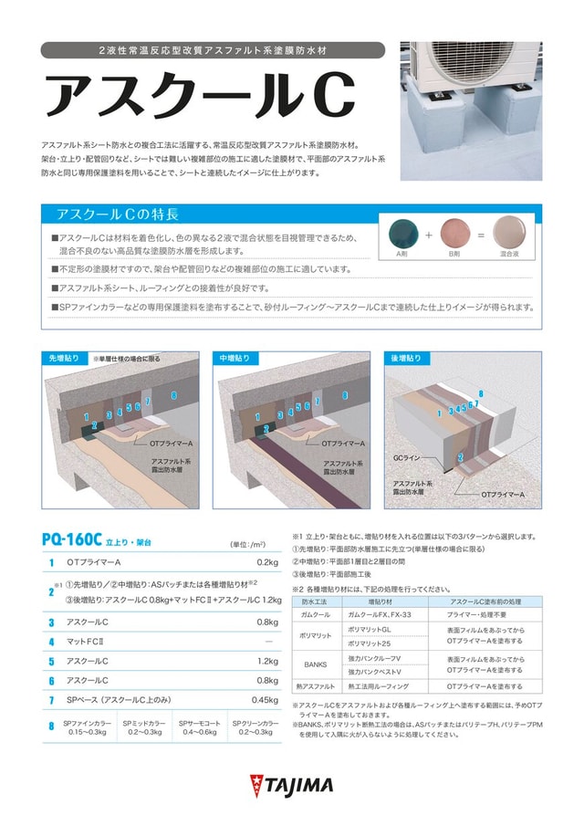平面部で優位なシート系材料が苦手とする架台・配管廻りなどの複雑部位に適した塗膜防水材です。平面部がシート系防水材、立上りや複雑部位がアスクールCによる組合せは、各々の長所が噛み合うことでより確実な防水層形成につながります。