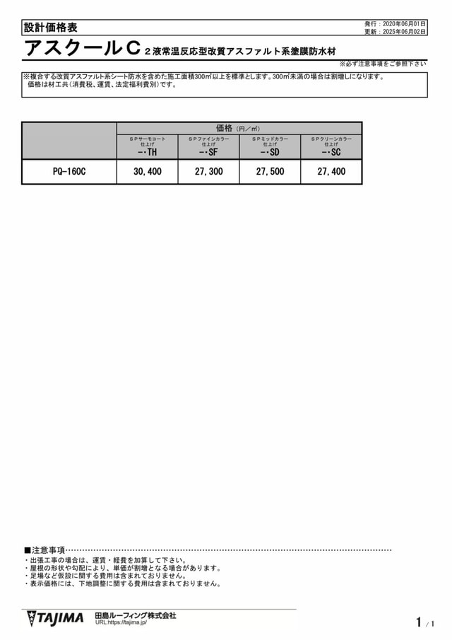 アスファルト系シートやルーフィングとの接着性に優れているため、それらと連続した防水層を形成できます。両者共通の保護塗料を用いますので、シート(ルーフィング)~アスクールCまで連続した仕上りイメージが得られます。