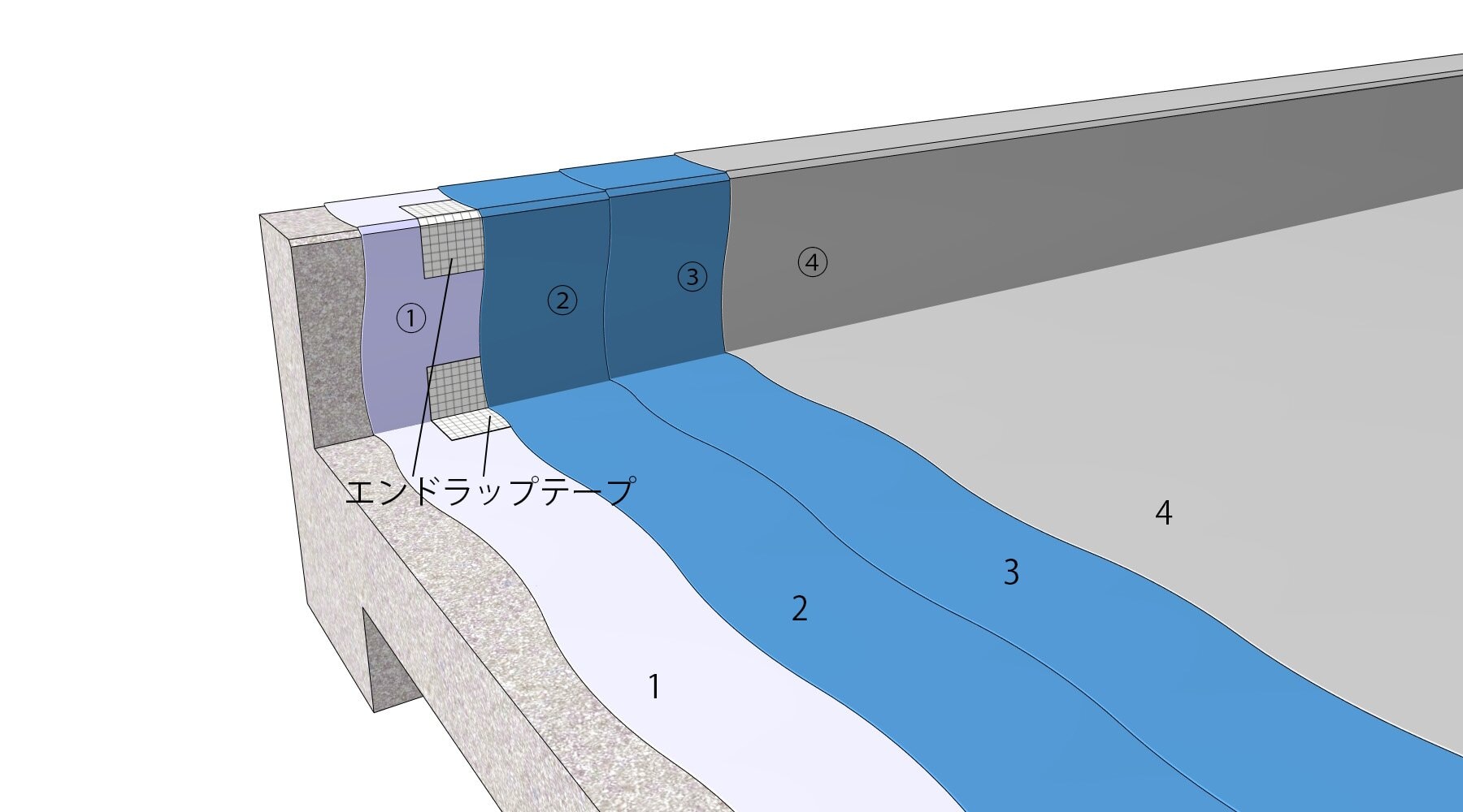 • 立上り部工程1の後、入隅部、出隅部にはエンドラップテープを施工します。エンドラップテープの使用にあたっては、貼付け箇所の形状に応じて、50、100、200を使い分けてください。