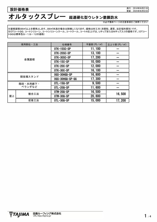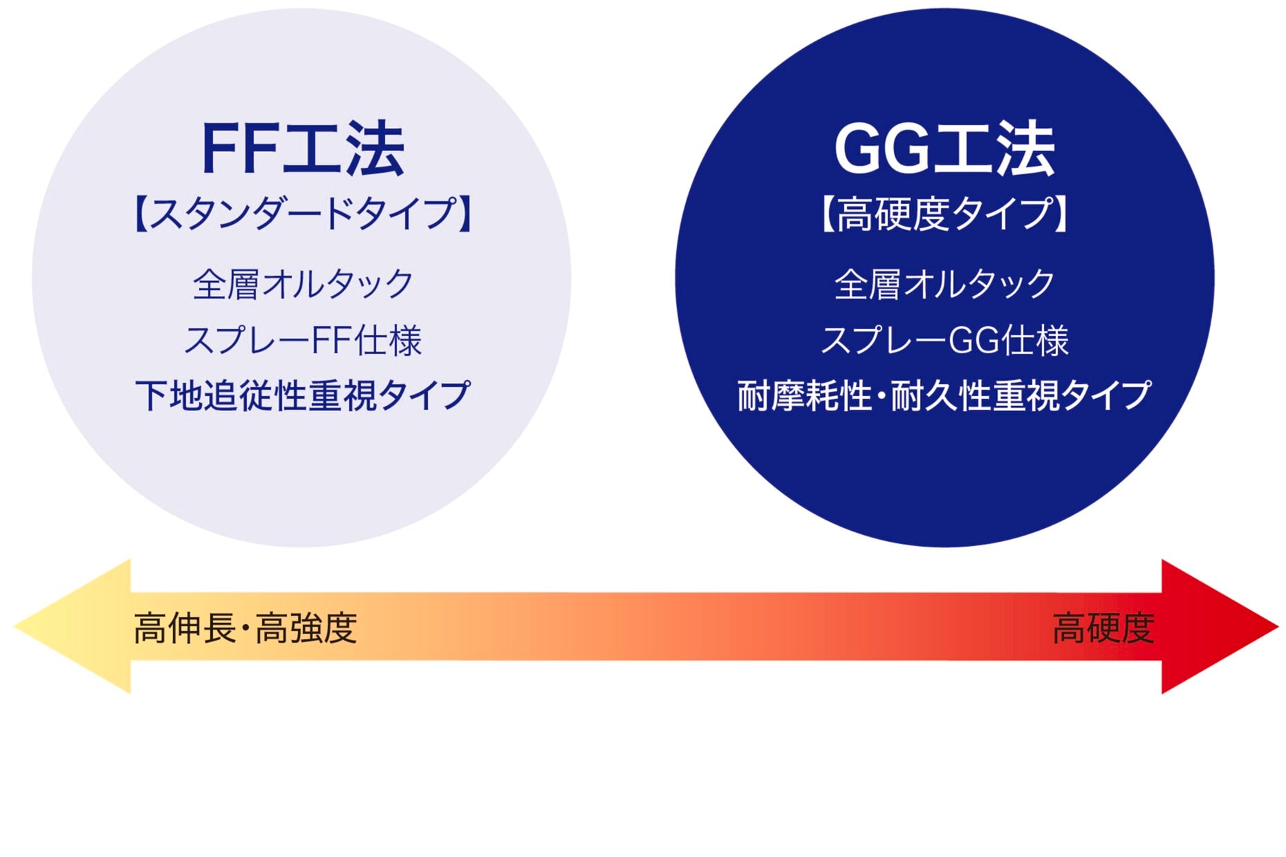 物性バランスに優れた高伸長・高強度形スタンダードタイプの「オルタックスプレーFF」と耐摩耗性を備えた高硬度タイプの防水材「オルタックスプレーGG」の2タイプをご用意。下地条件や用途に合わせてお選びいただけます。