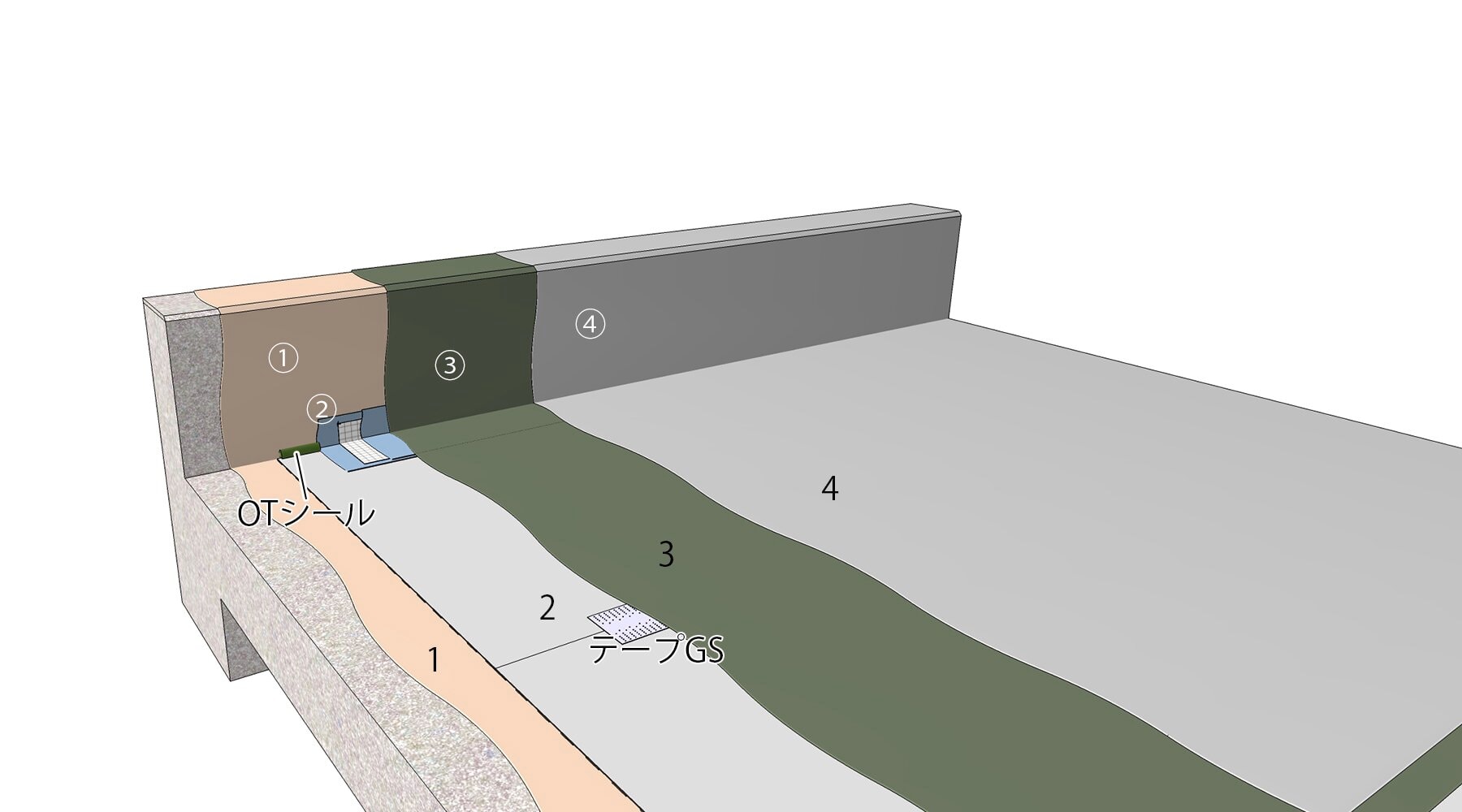 - 立上り面に凹部がある場合には、スプレーのピンホール防止として、プライマー硬化後にオルタックサンキュアTにて目留め処理することをおすすめします。降雨が予想される場合には、テープGS部分にも塗布してください。