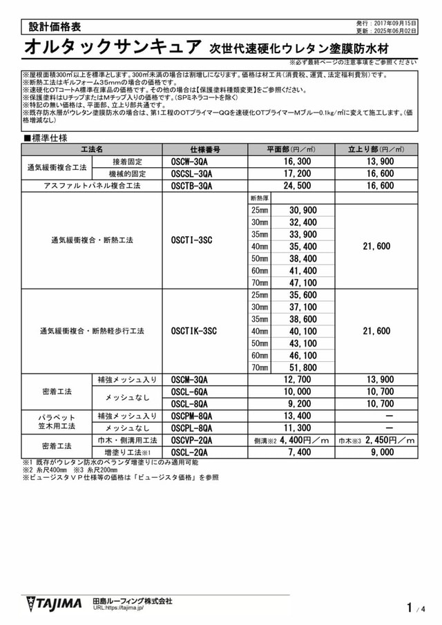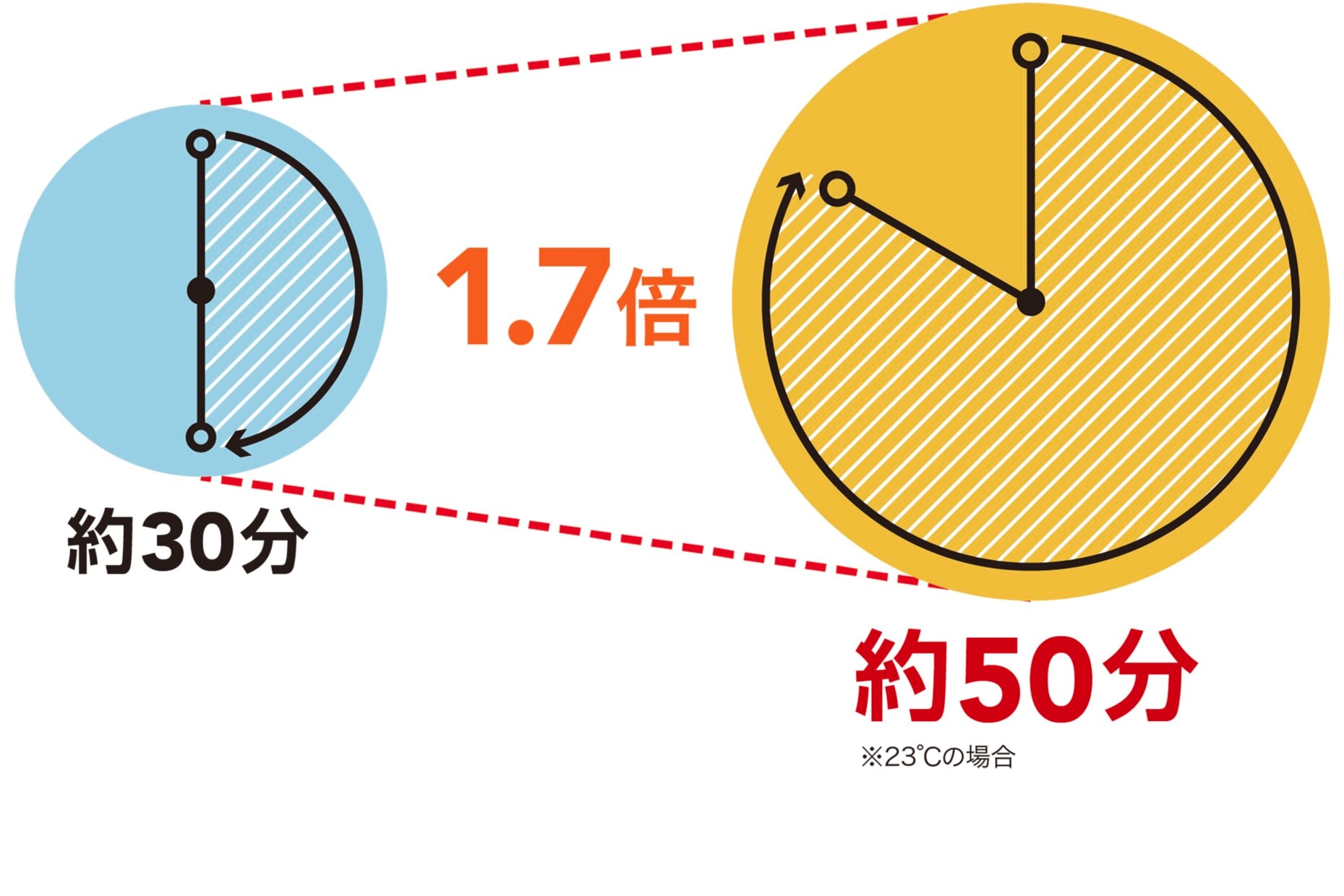速硬化ウレタン塗膜防水材は硬化が速い一方で、可使時間が短く使いにくいという弱点がありました。オルタックサンキュアは、従来配合の見直しと新たに取り入れた触媒により、速硬化の特性を維持しつつ可使時間を従来比1.7倍に伸ばしました。通常硬化タイプと比べても遜色ない施工性となっています。