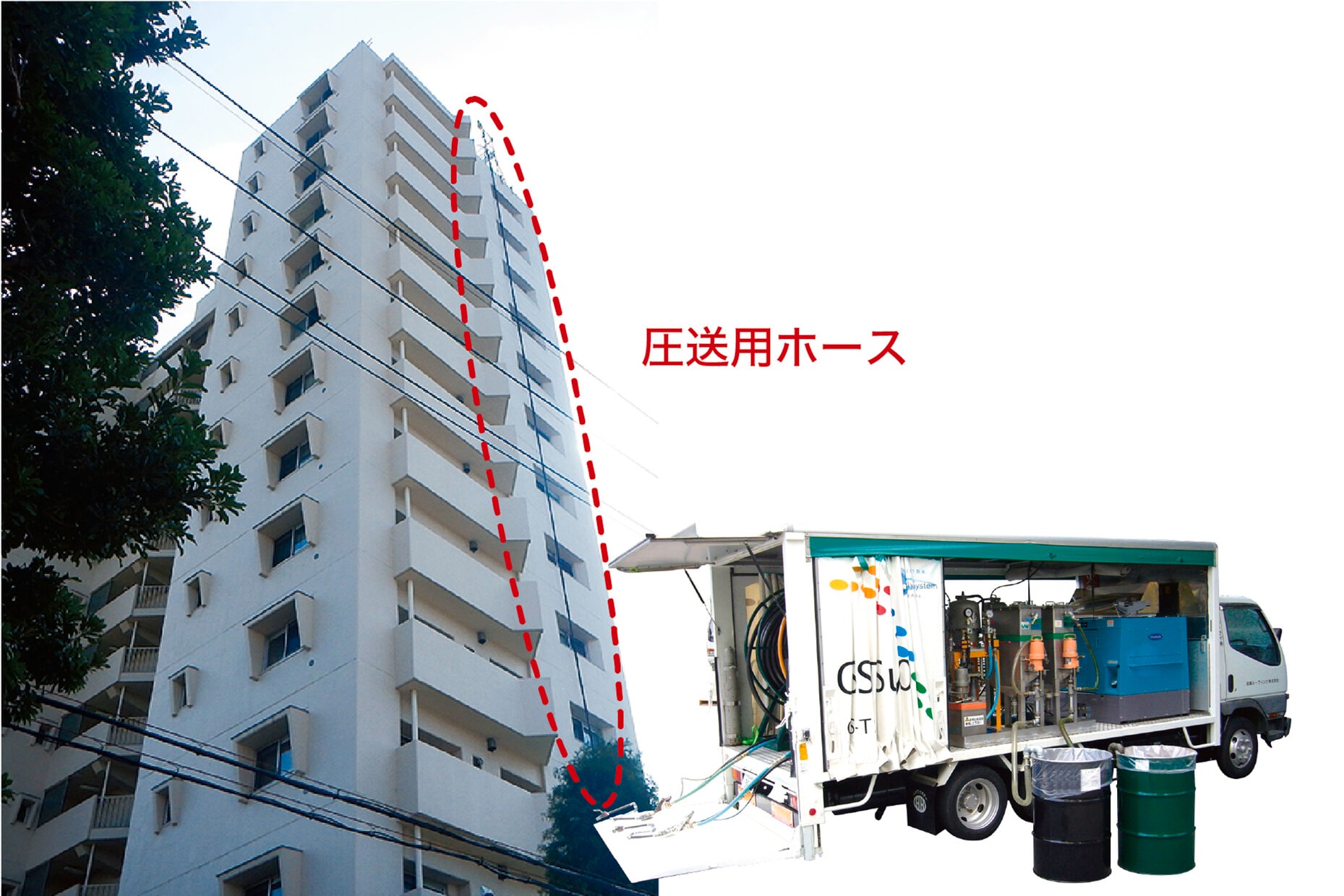 平面部用のウレタン向け自動混合・圧送システム(OSS)は計量や攪拌作業等の手間が省け、さらに材料荷揚げの手間も不要で大幅な省力化に貢献します。オルタックサンキュアとOSSの組合せは工程の進捗がさらにスムーズとなり、1日2工程も可能です。自動混合のOSSは撹拌不良もなく安心です。