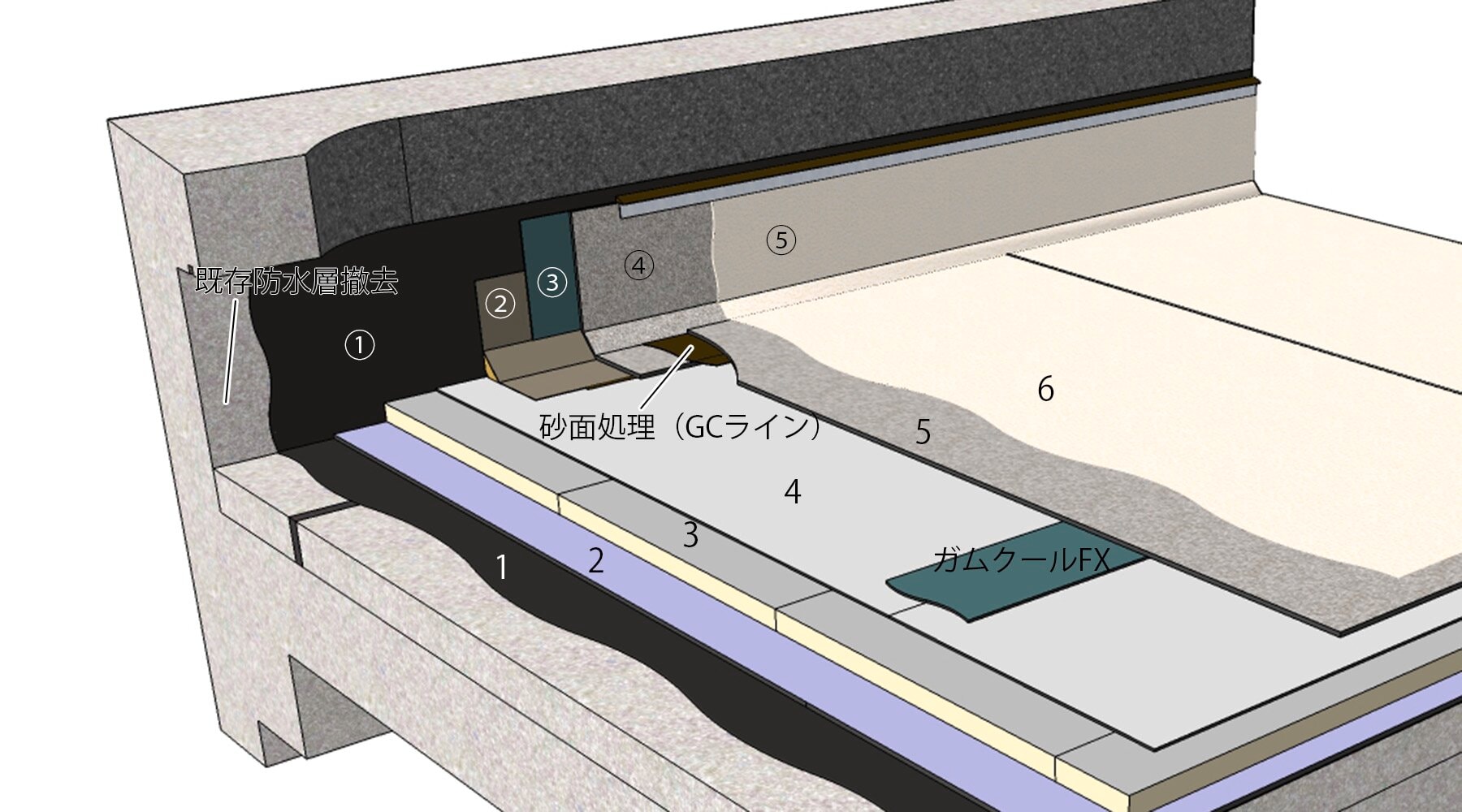 - 季節や立地条件によって、水性プライマーASの代わりにアスファルトプライマー、アスファルトプライマーSSを使用する場合もあります。立上りは原則既存防水層は撤去のため、プライマーはモルタル、コンクリート下地を想定しています。他の仕上げとなる場合のプライマーの選定については、ご相談ください。