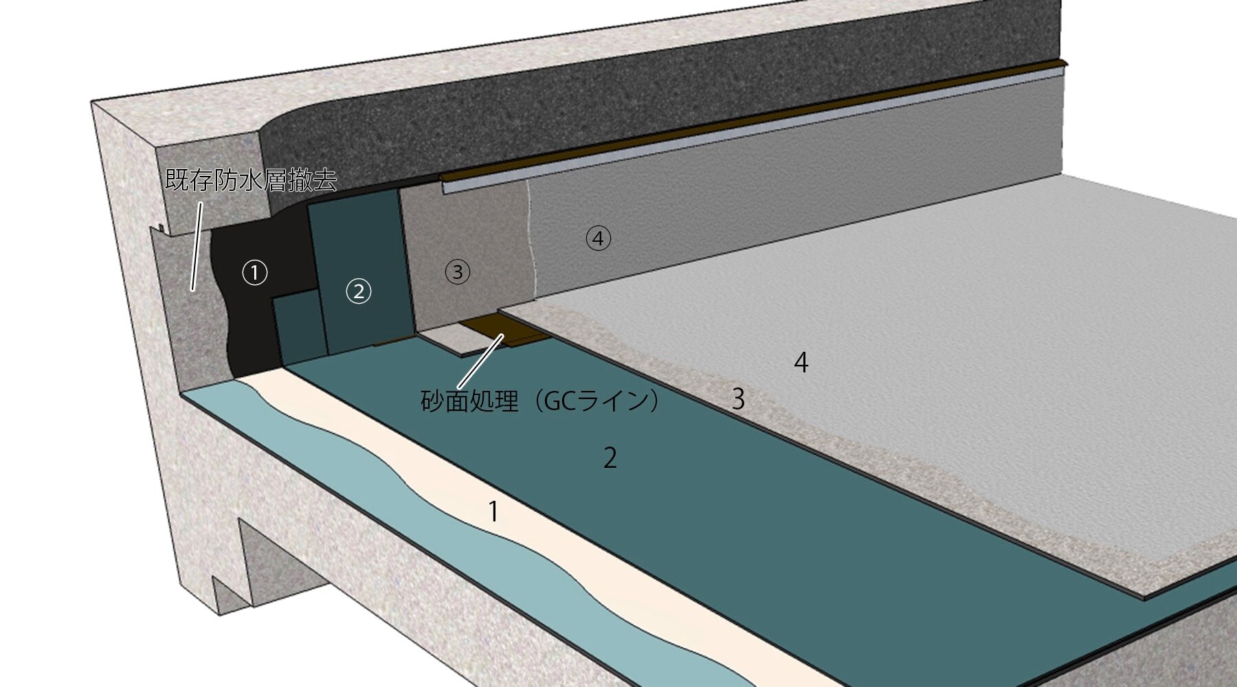 - 季節や立地条件によって、水性プライマーASの代わりにアスファルトプライマー、アスファルトプライマーSSを使用する場合もあります。立上りは原則既存防水層は撤去のため、プライマーはモルタル、コンクリート下地を想定しています。他の仕上げとなる場合のプライマーの選定については、ご相談ください。