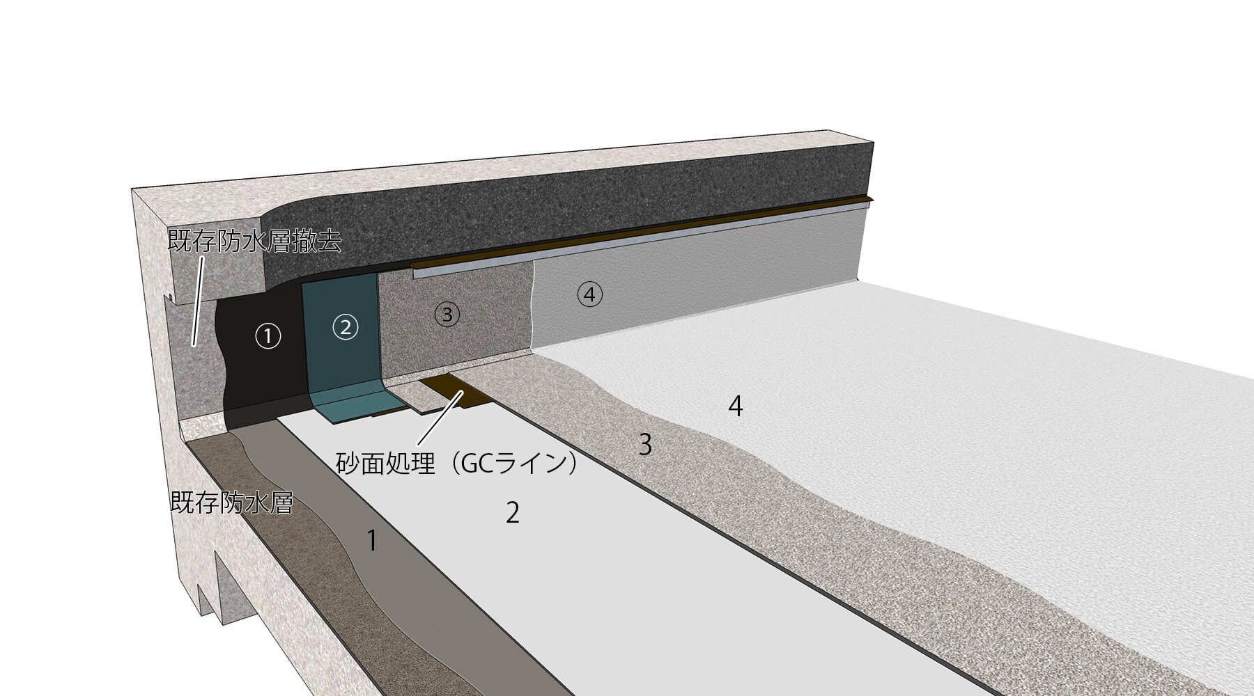 - 季節や立地条件によって、水性プライマーASの代わりにアスファルトプライマー、アスファルトプライマーSSを使用する場合もあります。立上りは原則既存防水層は撤去のため、プライマーはモルタル、コンクリート下地を想定しています。他の仕上げとなる場合のプライマーの選定については、ご相談ください。
