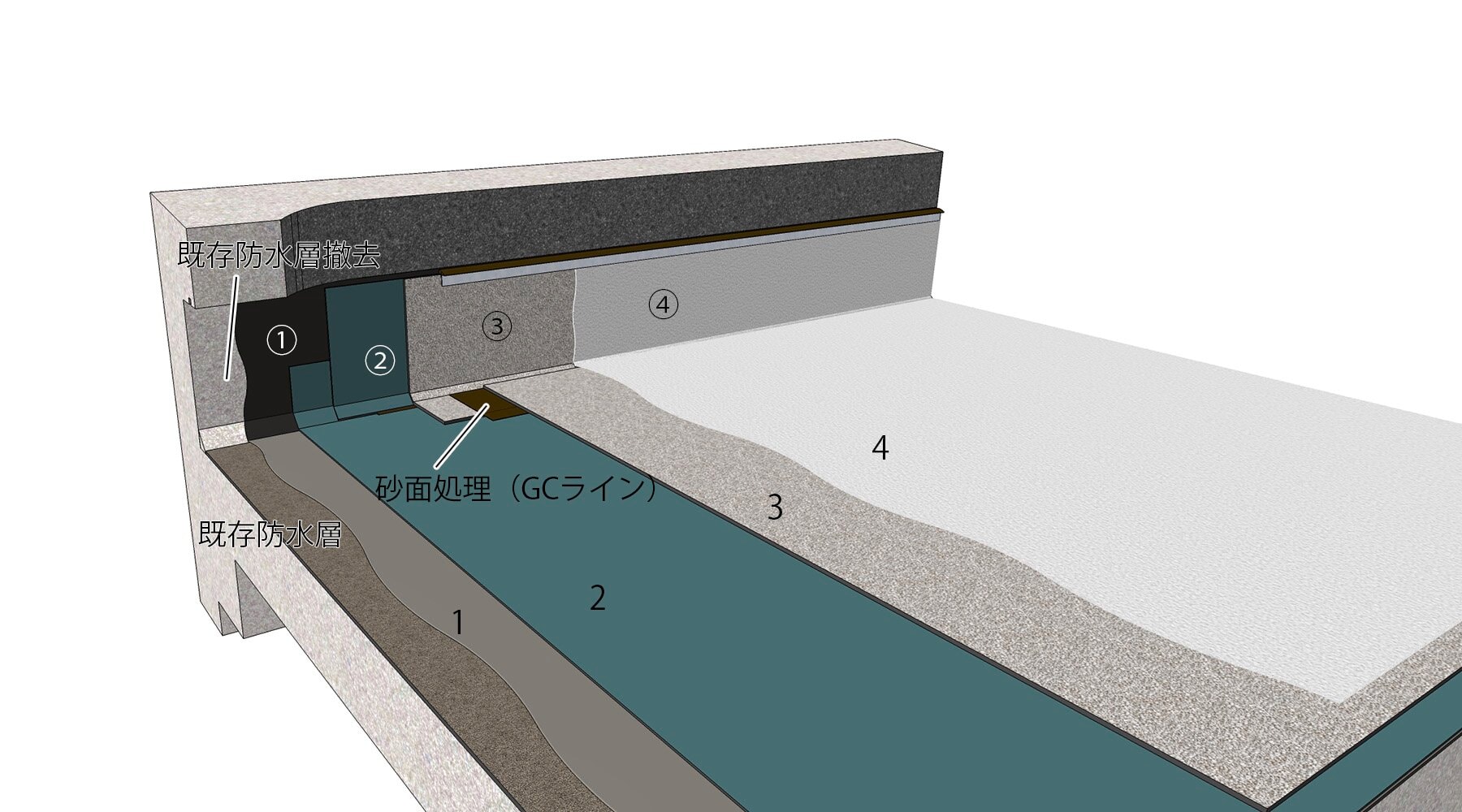 - 季節や立地条件によって、水性プライマーASの代わりにアスファルトプライマー、アスファルトプライマーSSを使用する場合もあります。立上りは原則既存防水層は撤去のため、プライマーはモルタル、コンクリート下地を想定しています。他の仕上げとなる場合のプライマーの選定については、ご相談ください。