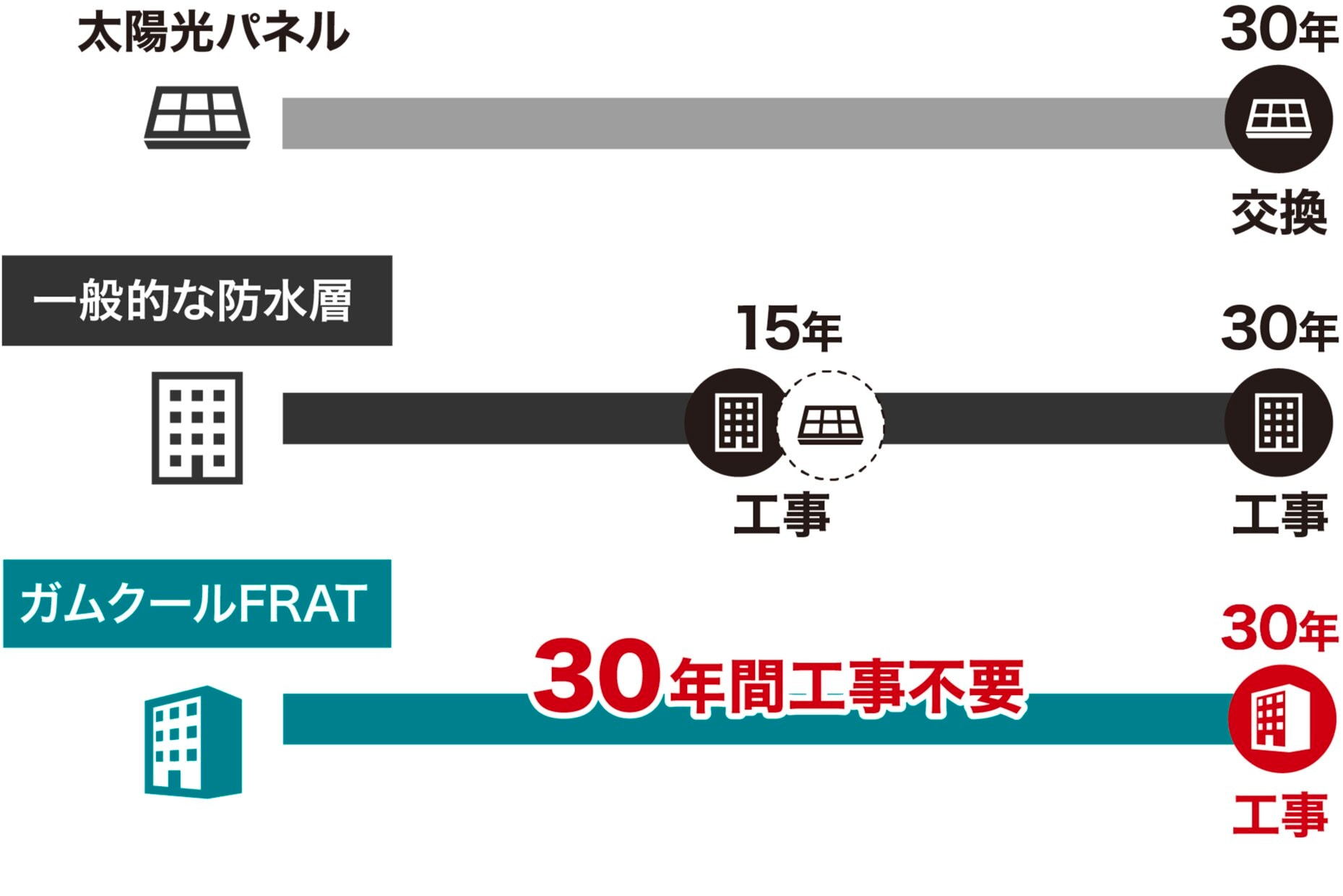 太陽光パネルと同時に施工すると、防水層の改修工事は30年後になるため太陽光パネルを一度も撤去することなくフル稼働が可能になります。