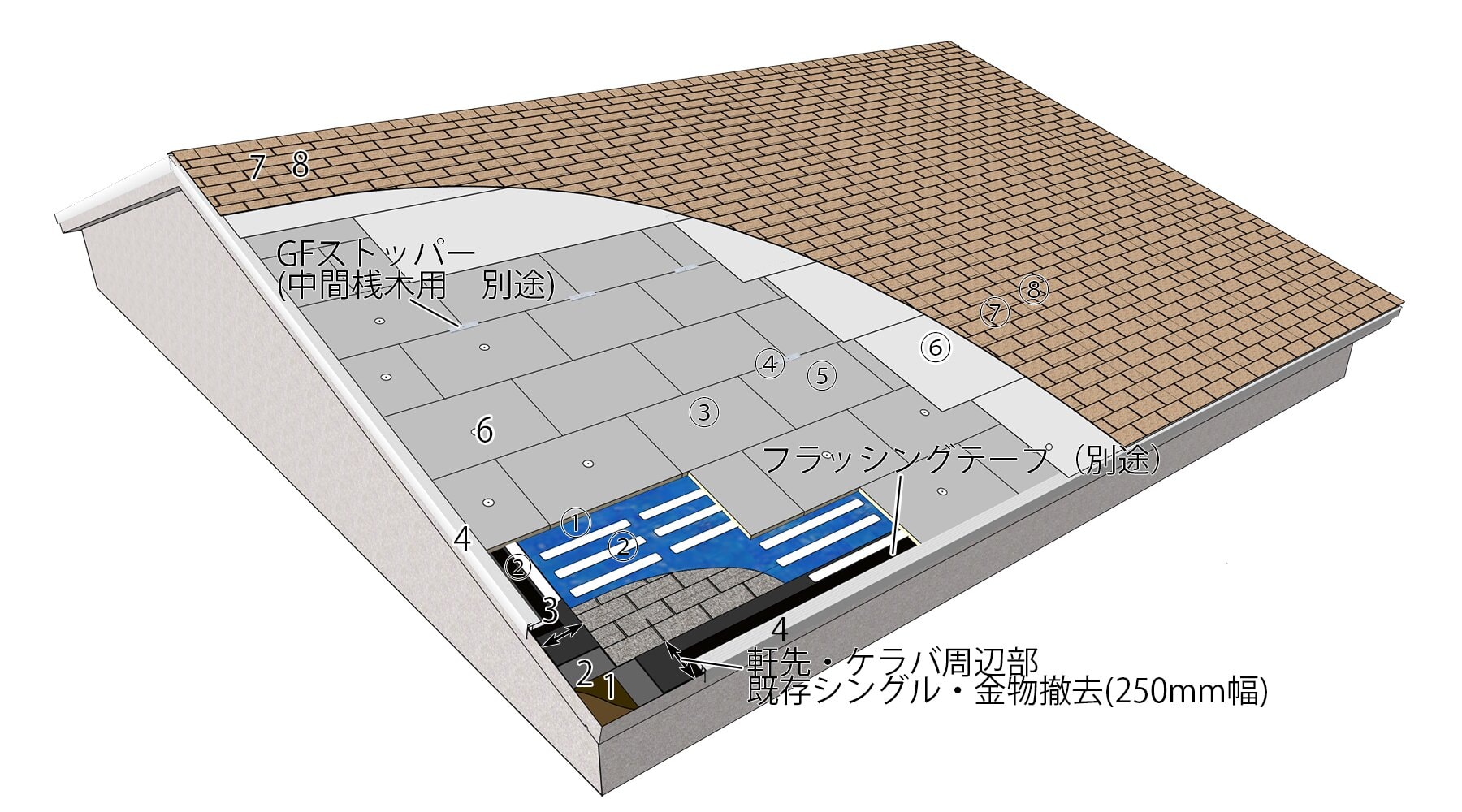 - 水切り金物はシングルドリッパーTとシングルエッジT、中間桟木としてGFストッパーを標準としています。