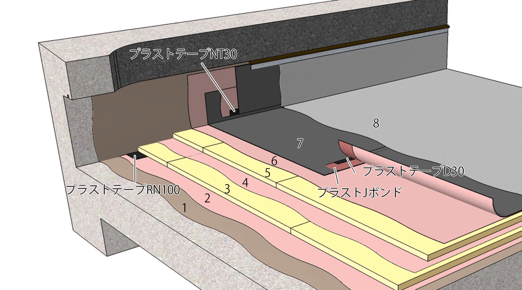 - プラストシートのジョイントには、プラストJボンド(0.3+0.3kg/m2)とプラストテープD30を使用してください。
