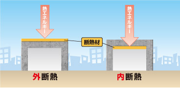 熱が伝わりにくい素材として、ウレタンやポリスチレンを発泡させた「断熱材」を使用し建物内外の熱移動を防ぎます。建物の外側に断熱材を設ける工法を「外断熱工法」といいます。室内側に断熱材を設ける「内断熱」と比べ、外気の変化をコンクリートに伝えにくくするため、省エネに加え躯体保護にも効果があります。