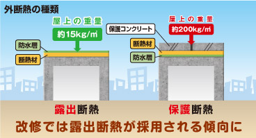 外断熱工法は、防水層との組合せで採用されます。屋上を利用しない非歩行の屋上や既存防水層の改修工事では、重い保護層を設けない「露出断熱防水」が採用される傾向にあります。
